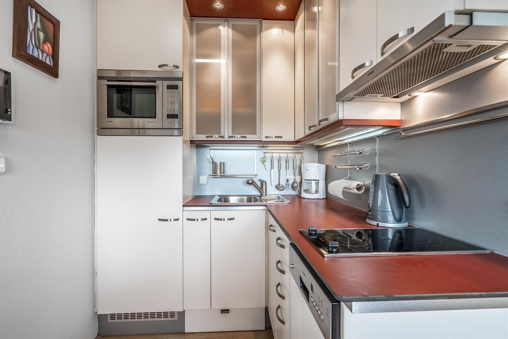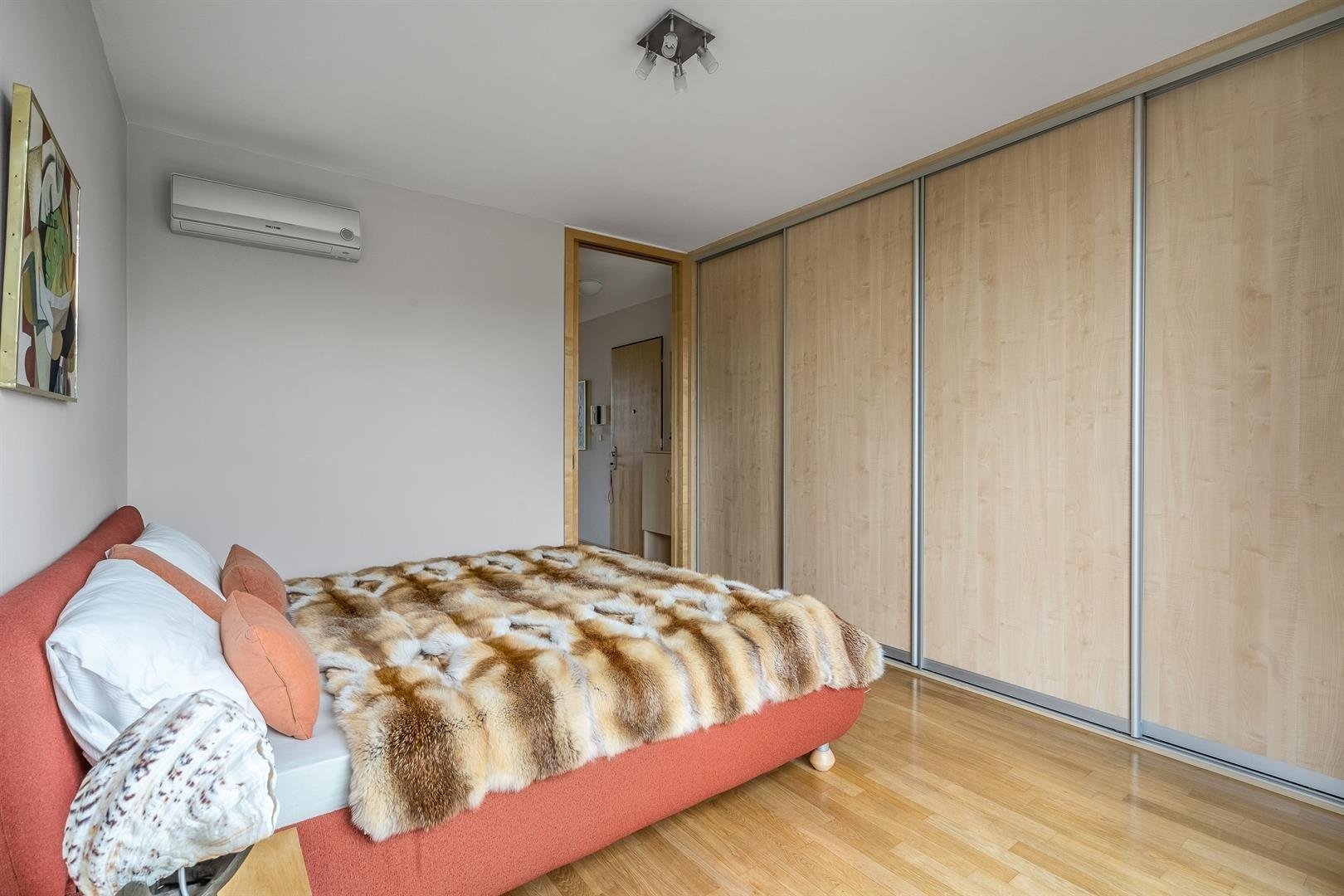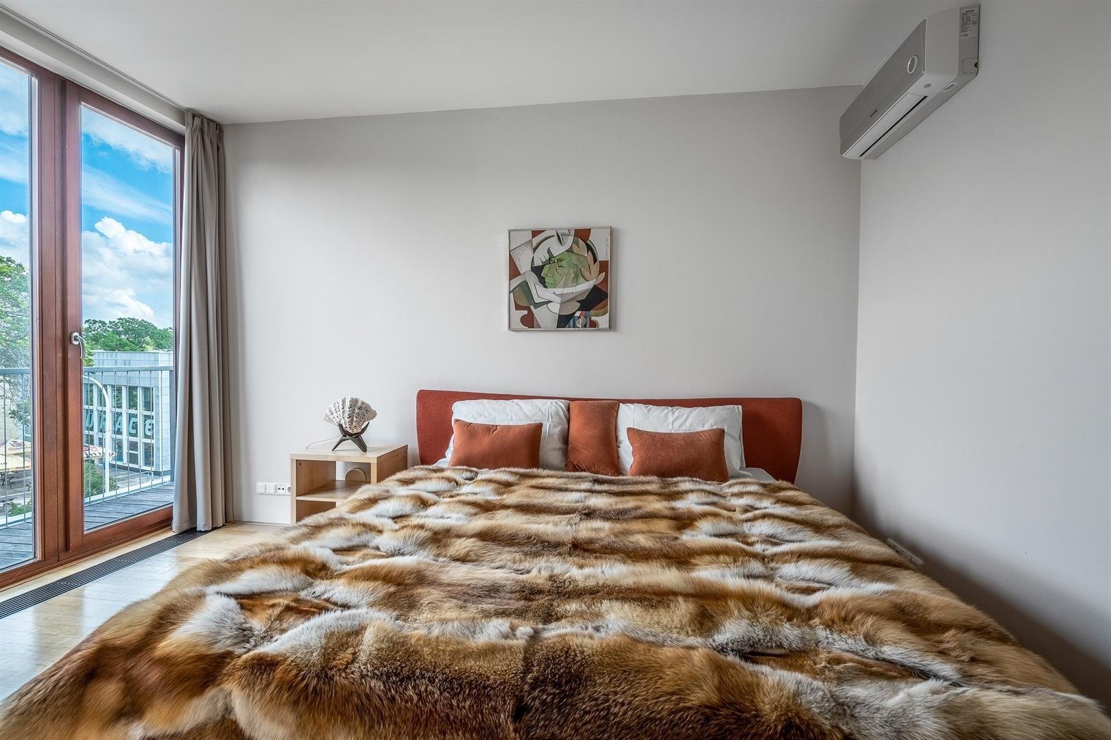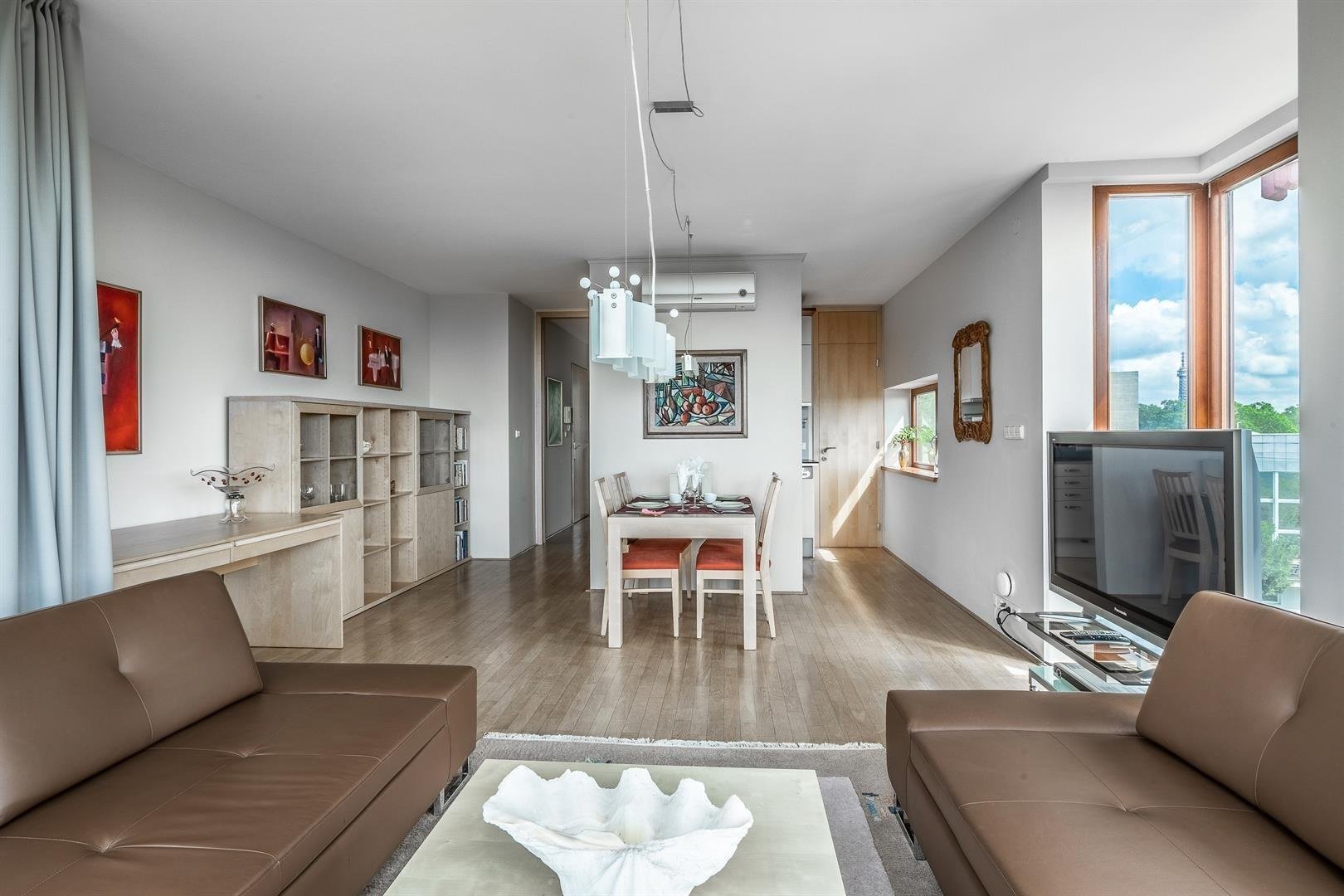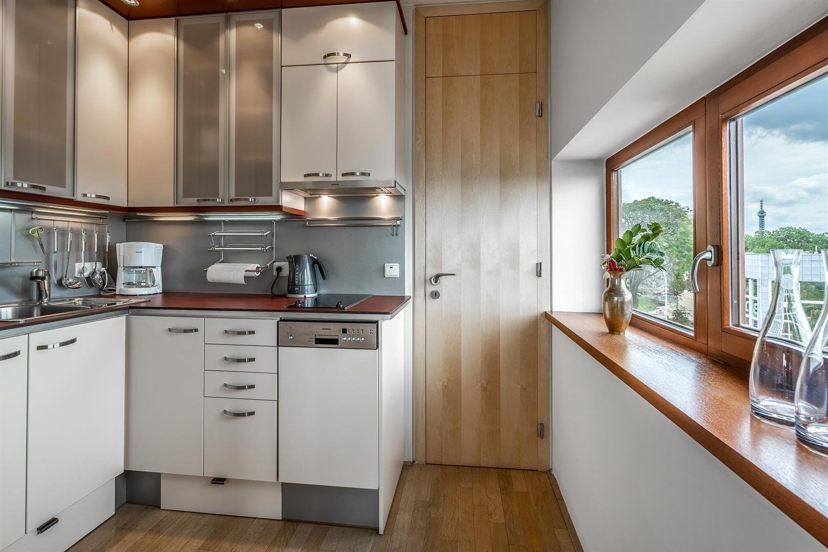 Dispozice bytu je tvořená velkým obývacím pokojem s panoramatickým výhledem na Prahu, prostornou ložnici s balkonem, oddělenou kuchyňskou linkou s komorou, koupelnou se sprchovým koutem a výhledem na centrum Prahy, samostatným WC a chodbou. Byt je vybaven kvalitním nábytkem, a je celý klimatizován. K bytu náleží parkovací stání v podzemním parkovišti a sklepní koje.